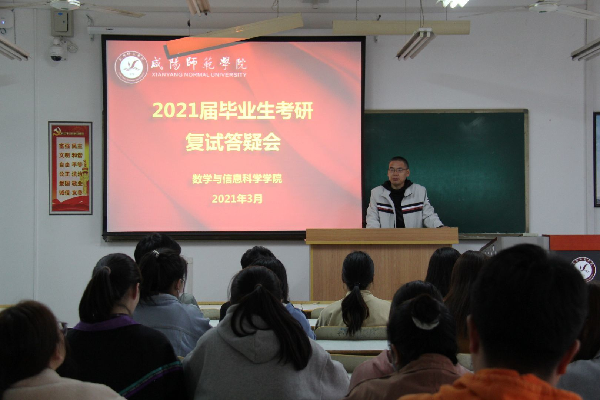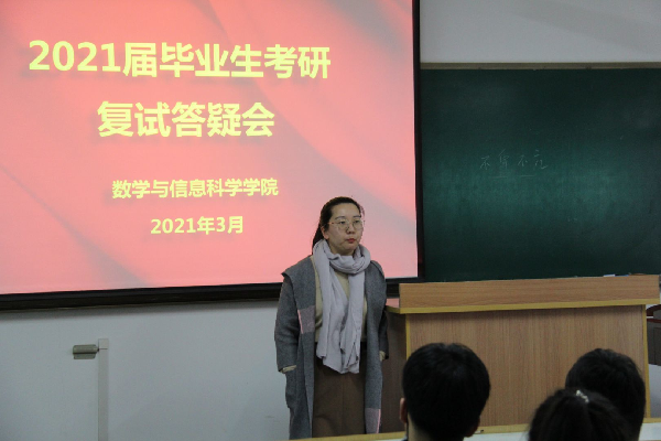 3月18日, 数学与信息科学公司召开2021届毕业生考研复试调剂答疑会。会议由毕业班辅导员朱墩子主持,应用数学系教师、考研上线同学参加了会议。