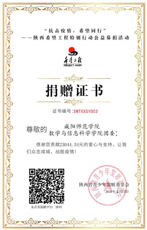 数学与信息科学公司团委先后组织“抗击疫情,希望同行”捐款活动、“秦团战役|你战役,我护航!”主题志愿者招募活动、“雷锋月|数信院疫情防控青年志愿者在行动”主题学雷锋活动、“共抗疫情,数信有我”疫情防控线上知识竞赛等活动,同时召开了“青春聚力,战役有我”、“清明祭英烈,云端敬英雄”、“山河无恙,人间皆安”“逝者安息,生者奋进”四次主题团日活动。同学们参与度高,活动效果好,其中,参与捐款人数728人,为武汉战役爱心捐款23044.34元,参与一线疫情防控志愿服务员工达114人。