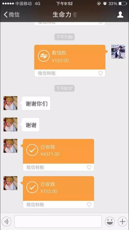 春节前夕,正当广大师生沉浸在放假伊始、迎接新春的快乐之中,公司政治与社会学公司2015届毕业生屠之镇家里突发意外,其姐姐、姐夫被歹徒杀害,年仅6岁的外甥女被砍成重伤住院,需要高昂的住院医疗费用。 得知这一消息后,数学与信息科学公司团委向全院员工发起募捐倡议,为无辜的小静静(屠之镇外甥女)筹集医药费,大家以微信红包的形式,你10元,我20元,他50元……,纷纷向小静静伸出了援助之手。通过短短一周时间,共筹集到善款4524元,通过微信如数转给了屠之镇本人。经过持续治疗,小静静身体已经逐渐康复。
