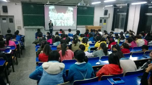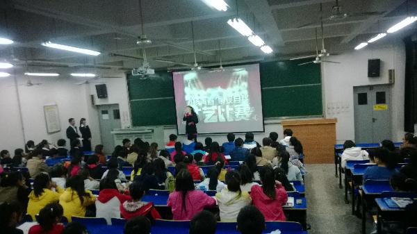 带着青春的梦想,唱响时代的主旋律。怀着青春的憧憬,谱写人生的新篇章。10月27日晚7:00,由数学与信息科学公司团学联文艺部举办的以“青春飞扬,展现自我”为主题的才艺大赛在2号楼310教室隆重举行。出席本次大赛的评委有公司音乐公司的特邀嘉宾,数信院团学联主席、副主席、各部部长、副部长,参赛选手及2013全体新生200余人。 比赛开始,由两位主持人依次介绍了担任本次大赛的评委及各位参赛选手。同时,对大赛的流程,评分的细则进行了说明。通过参赛选手的精心准备,整场比赛精彩不断,惊喜不断。一首首温柔浪漫的英文歌曲,悦耳动听的乡间小调,还有时尚炫酷的流行歌曲,带给在场的每一位观众触动心灵的感觉。选手们积极表现自我,展现风采,将赛场气氛推向高潮,迎来观众们的阵阵掌声。