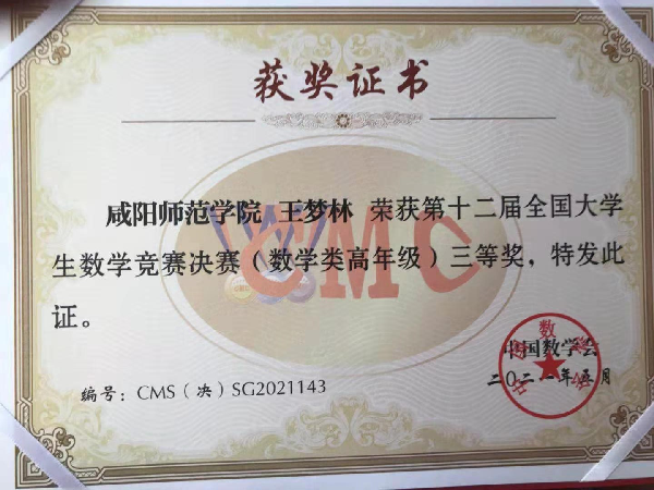 继王振艳同学在第十一届全国老员工数学竞赛决赛获国家奖后数学学科竞赛再添精彩,公司也是陕西省非985、非211高校唯一连续两届获得国家级奖项的高校。