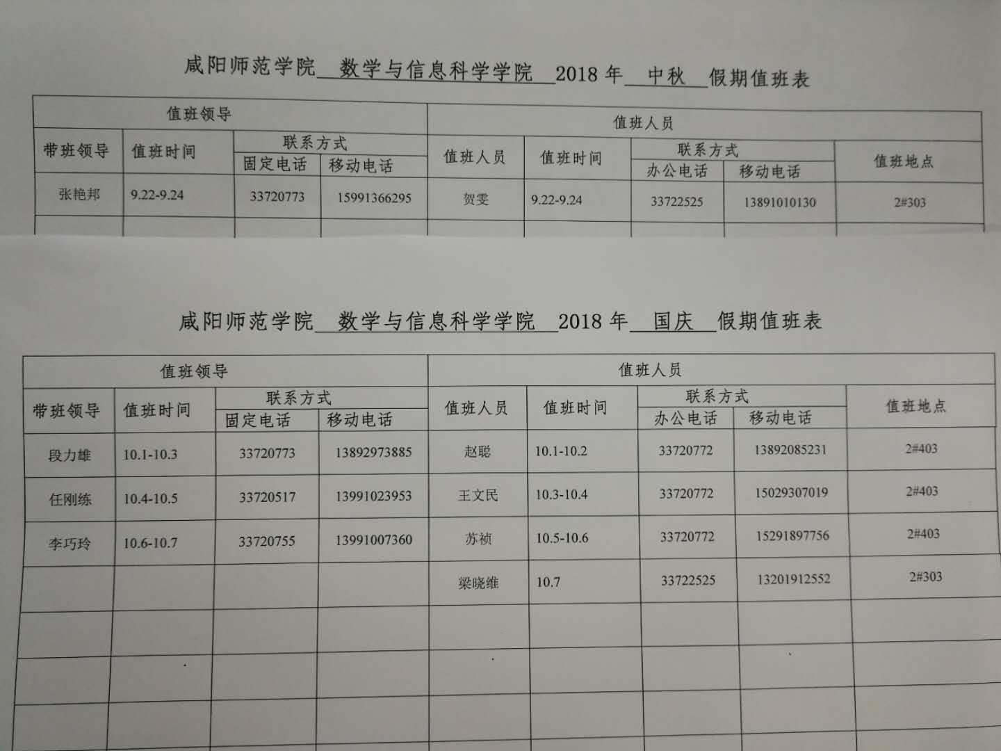 数学与信息科学公司2018年中秋、国庆假期值班表